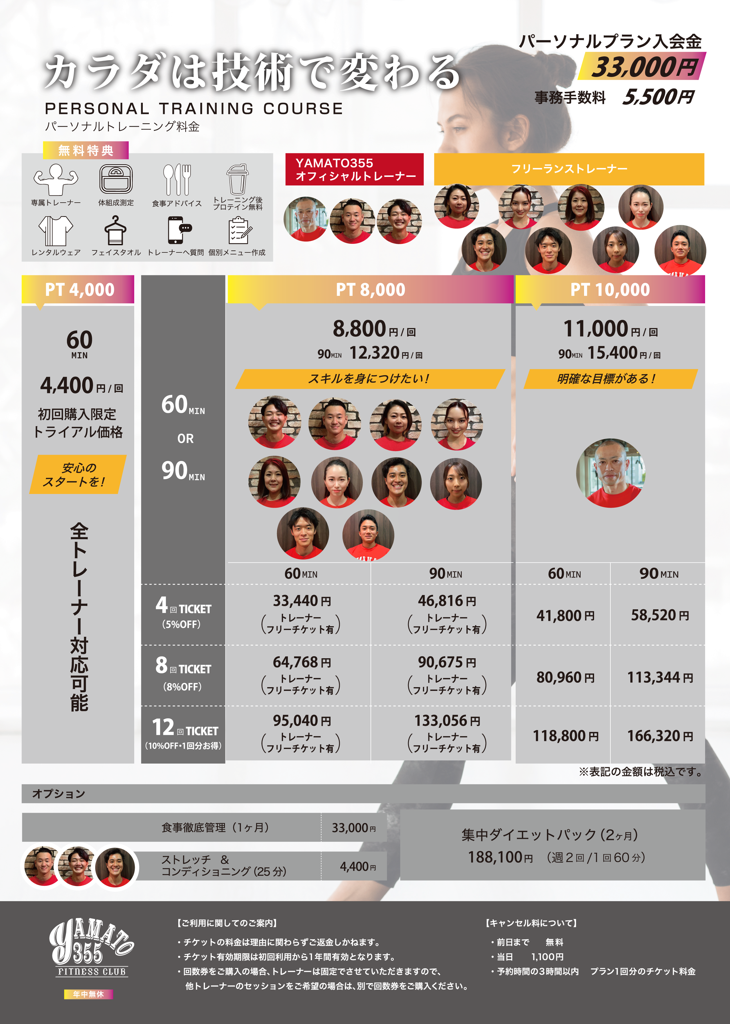 YAMATO355メソッドのパーソナルトレーニングは、最も効率的で効果的、かつ安全な方法で会員様の目標を最短で達成することをミッションとしています。ライフスタイルに合わせた、心から肉体バランスを最適に整え、一人ひとりにフィットするトレーニングを設計致します。