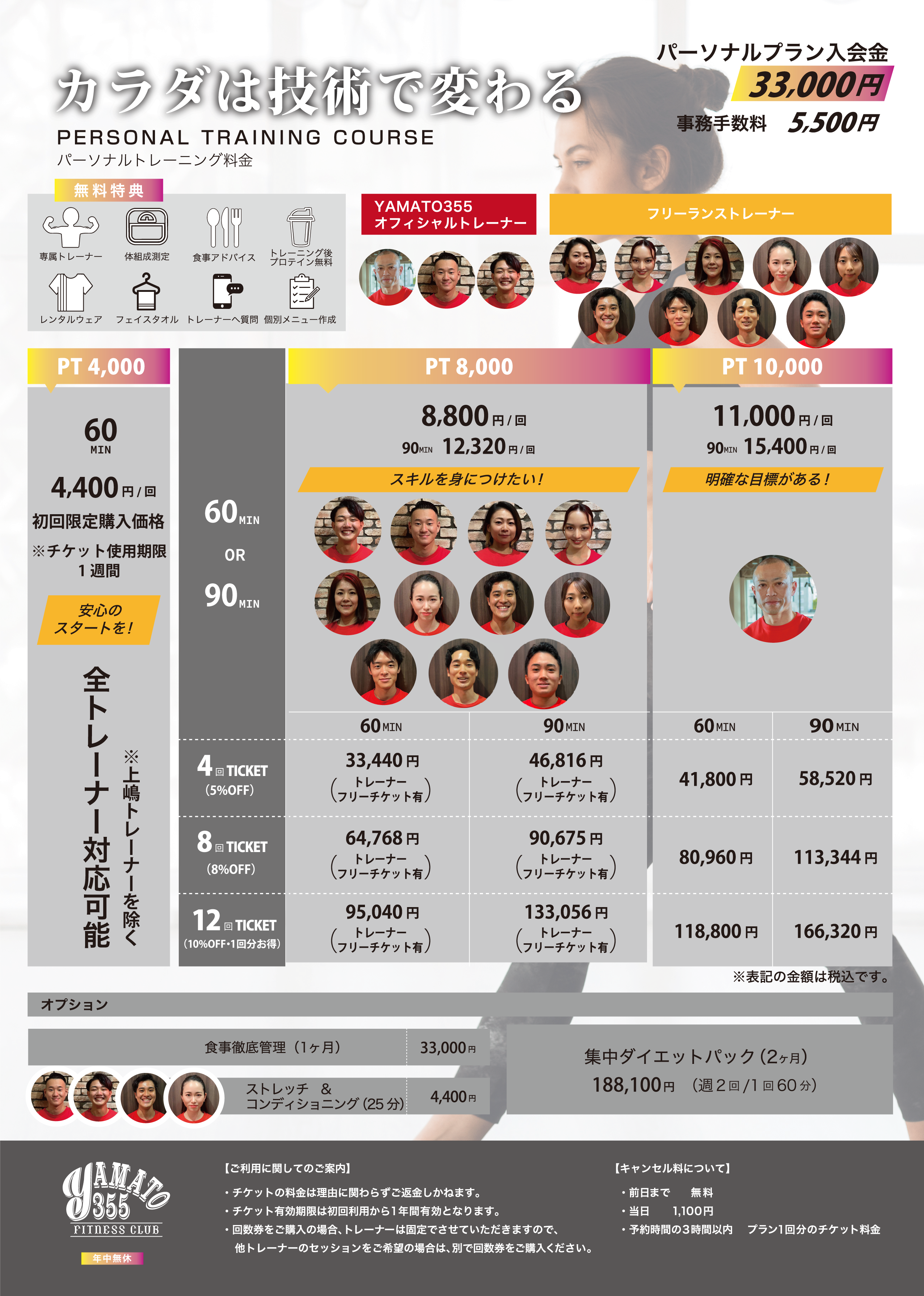 YAMATO355メソッドのパーソナルトレーニングは、最も効率的で効果的、かつ安全な方法で会員様の目標を最短で達成することをミッションとしています。ライフスタイルに合わせた、心から肉体バランスを最適に整え、一人ひとりにフィットするトレーニングを設計致します。